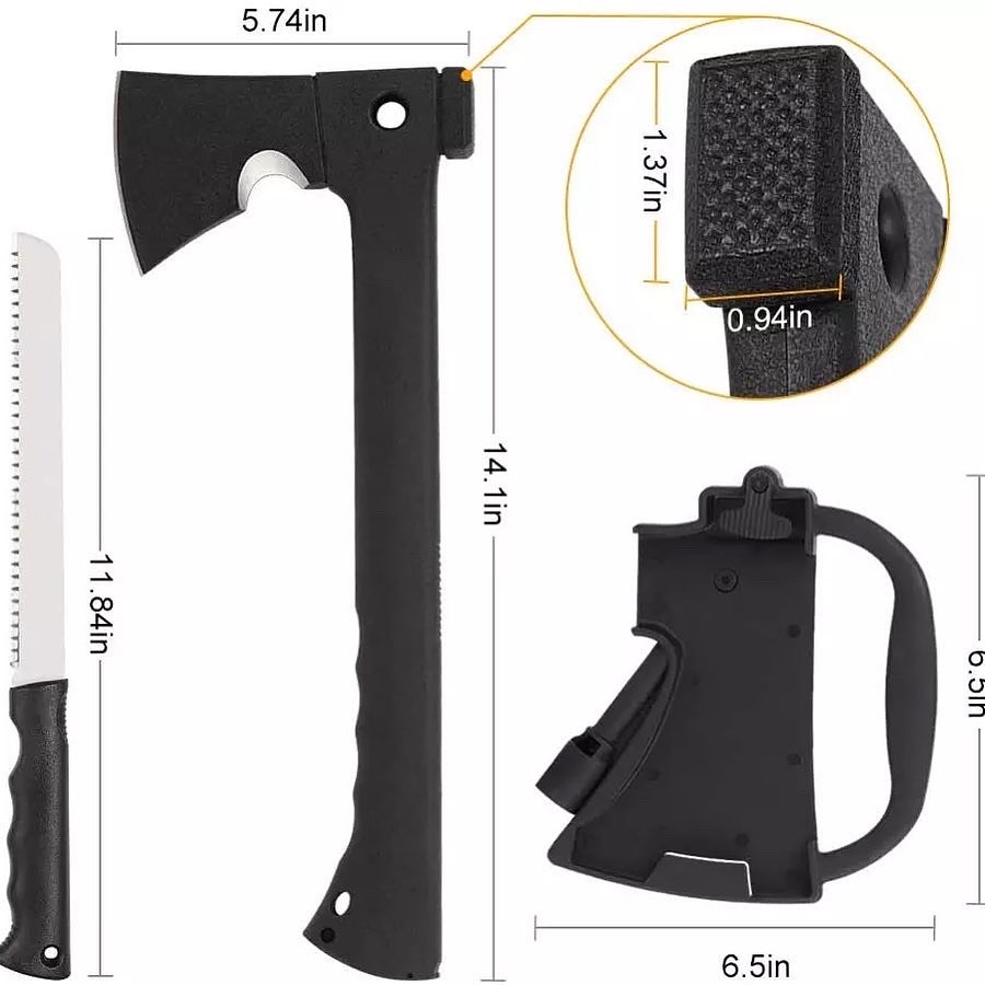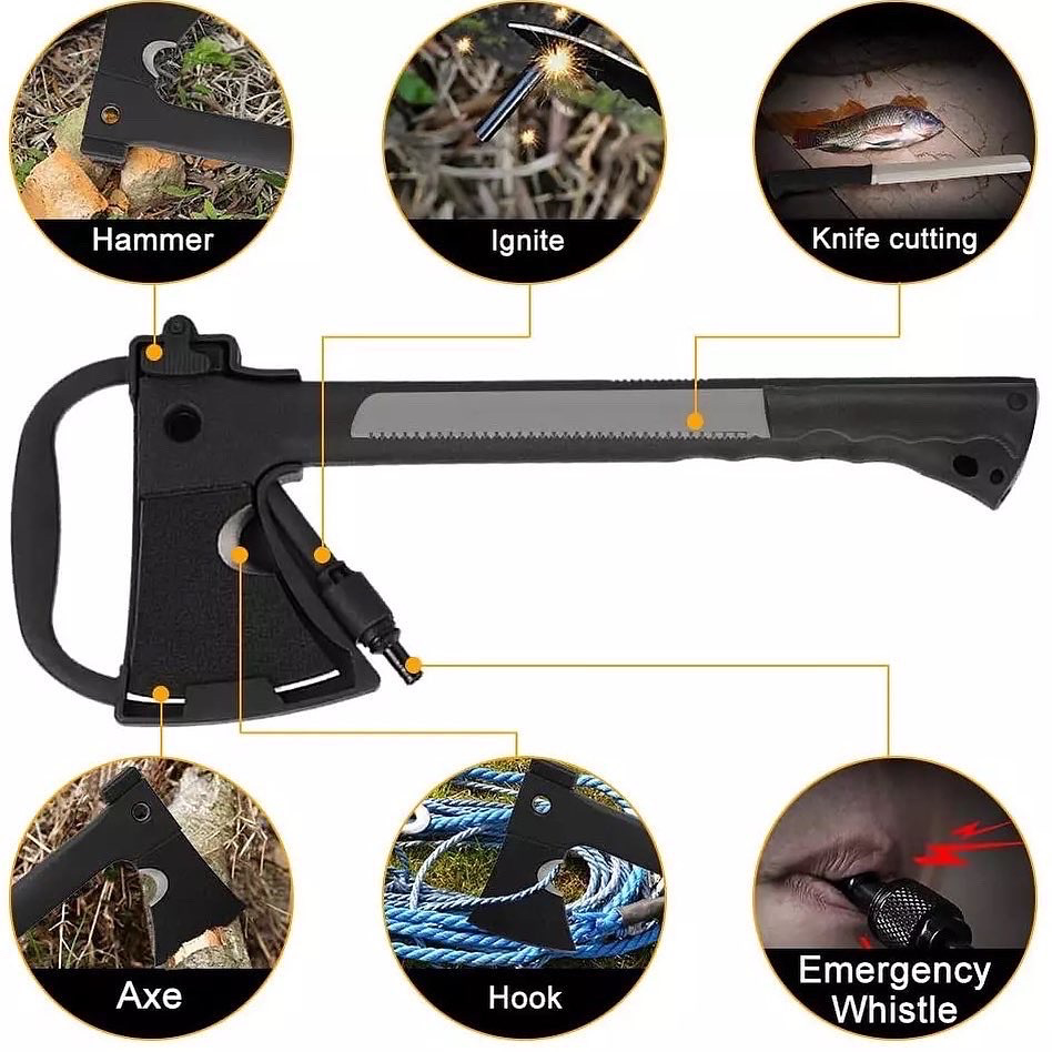 . فأس ذو جوده عاليه متعدد الاستخدامات 1-خفيف الوزن. 900 غرام 2-سكين منشار. 🔪 3-مطرقه. 🔨 4-المغنيسيوم مشعل النار 🔥 5-صافره انذار 6-فأس حاد للتقطيع 🪵 .
