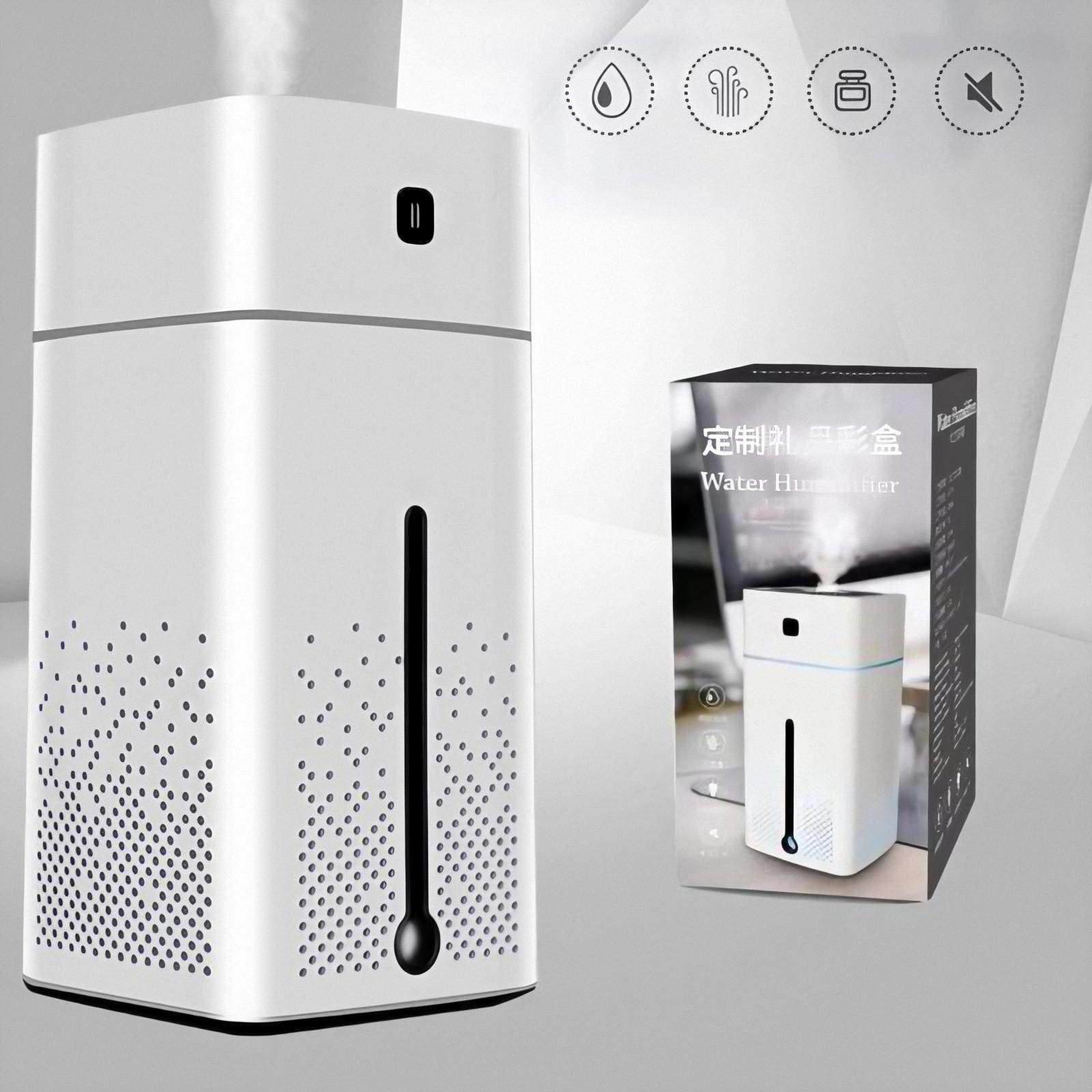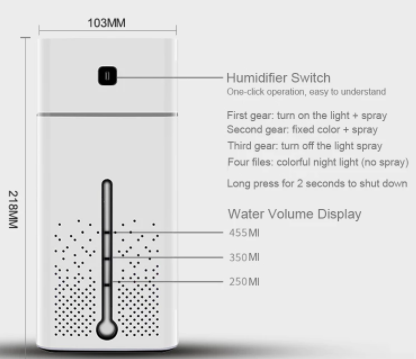 Capacity: 1000ml Power type: DC power supply Moisturizing quantity: 50ml/hour Application area: 30-40㎡ Noise level: 20dB-40dB Product size: 103mm*103mm*218mm Voltage: DC5V Applicable power: 3W