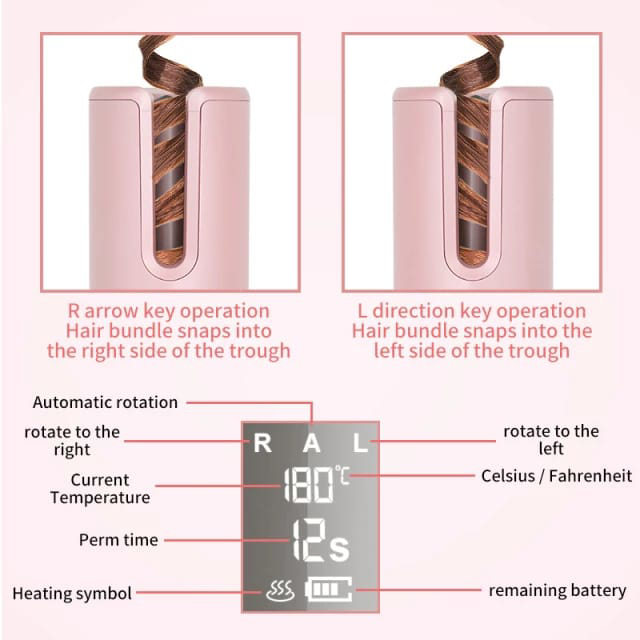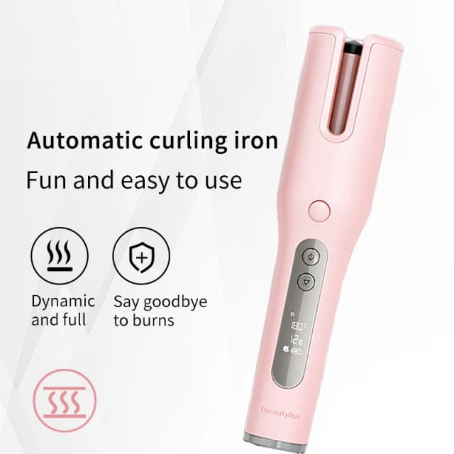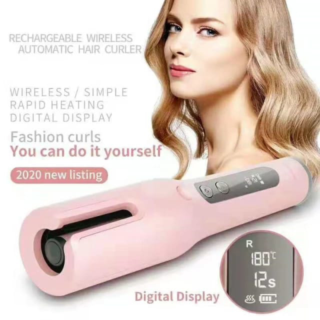 Auto Curling Iron with LCD Display Adjustable Temperature & Timer, Ceramic Hair Curler USB Charging and Rechargeable, Portable Hair Styler for Travel (Pink)