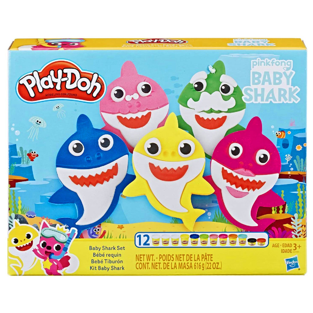 Doo Doo Doo! Make your own baby shark family out of Play-Doh compound with the 21 tools and 12 Play-Doh cans in this set. Use the Play-Doh cutters to make shark bodies and mouths in different sizes, then stamp eyes for them with the two-sided stamper. Tell fun stories by making fish, coral, and other sea life with the stampers and cutters. With over 1 pound of non-toxic Play-Doh compound, there's plenty for kids to share and let their imaginations swim free. This Play-Doh set is great for kids ages 3 and up who love pinkfong baby shark and getting creative with Arts and crafts like modeling clay! copyright smartstudy all Rights Reserved. pinkfong and baby shark are licensed trademarks of smartstudy.