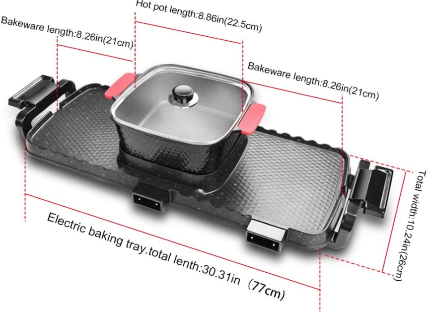 Medical stone coating non-stick pan, healthy-eco non-stick surface is PTFE-free and provides stick-free cooking. Food release is instant without oil required. The thickest sauces won't stick or leave residue behind. The Electric Grill Hot Pot is perfect for shrimps, burgers, hash browns, ribs, veggies, hot pot & more. 2200W electric stove Indoor hot pot, so you can freely adjust the precise temperature of the cooking products using the control dial next to it. Five levels of temperature control, adjustable from 0 ° C to 270 ° C, fast heating constant temperature control, no anxiety. You can cook while grilling. Package Dimensions 31.5 x 13.5 x 8 inches (80 x 34.3 x 20.3 cm) Item Weight 12.72 pounds (5.72 kg)