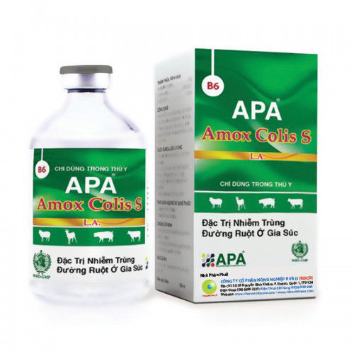Amox colis S مضاد حيوي يحتوي علي مادتين الاولي اموكيسيل( حبيب الطليان) + كولستين وهما يستخدمان لعلاج التهابات الجهاز التنفسي والهضمي والاسهالات والتهاب الضرع والتهاب الجهاز البولي والتناسلي يستخدم حقن عضلي و بالفم. 1ملم/10كيلو عبوة 100ملم