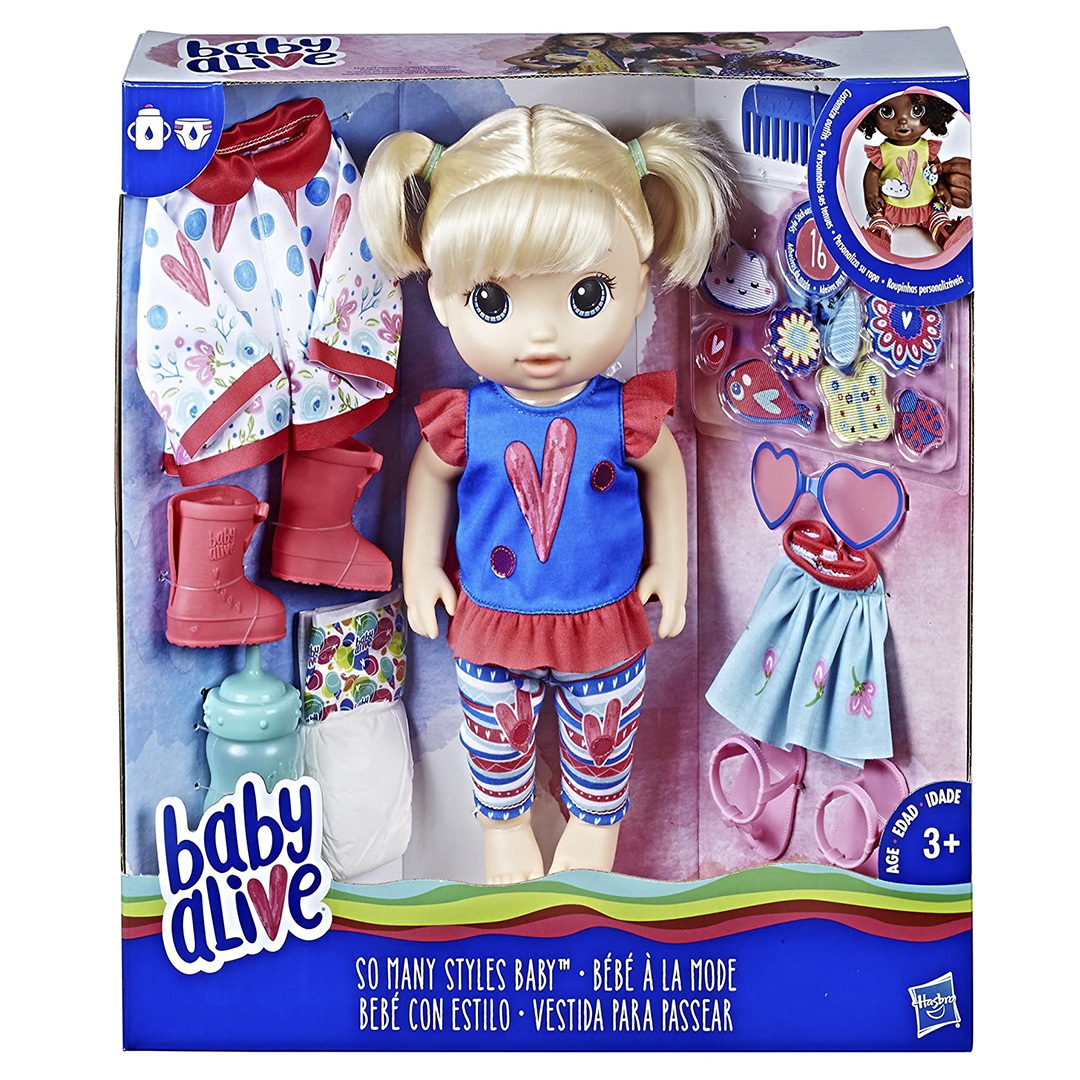Who gets excited when it’s time to get dressed? Baby Alive So Many Styles Baby does! She’s got a style all her own rain or shine, whether it’s wearing her raincoat and boots or her cute as ever sunglasses! This adorable baby comes with two full outfits and lots of accessories so kids can create different mix and match ensembles. Kids can even customize their looks with the included 16 style stick ons! So Many Styles Baby doll drinks water from her bottle and “pees” in her diaper like a real baby. Girls and boys will love dressing, changing, and snuggling with her all day long.