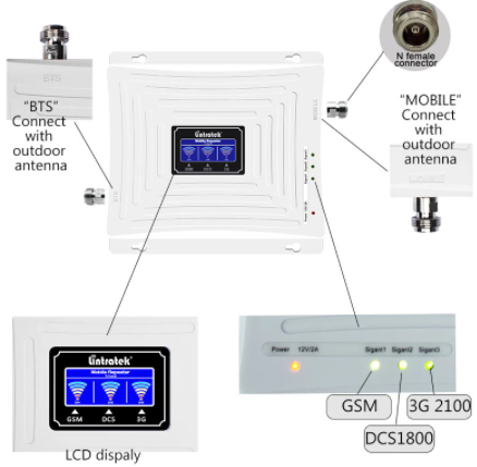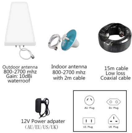 Working System: GSM+WCDMA+DCS (900mhz &1800 & 2100mhz) Feature: LCD Tri-band mobile signal booster gsm repeater booster: cellular signal booster 2G 3G 4G Signal booster: GSM900/Band 3(1800mhz)/3G 2100mhz Frequency Range Uplink: 880~ 915 mhz /1710~1785MHz/1920~1980MHz Frequency Range Down Link: 925~960mhz /1805~1880MHz/2110~2170MHz Power Supply: AC110V~240V,50/60Hz; DC:12V 2A Coverage: 500-1000sqm without barriers External Antenna: 10dbi Log-periodic 4G Antenna Internal Antenna: 2G 3G 4G indoor antenna, came with 2 meters cable 2g repeater part: enhance 2g gsm signal voice and call 3G SIGNAL BOOSTER: BOOST 3G DATA and call 4g signal BOOSTER: improve 4g internet network gsm repeater: cellular amplifier cellphone signal booster: cellphone signal repeater Mobile signal booster: cellular signal amplifier gsm amplifier: signal booster gsm