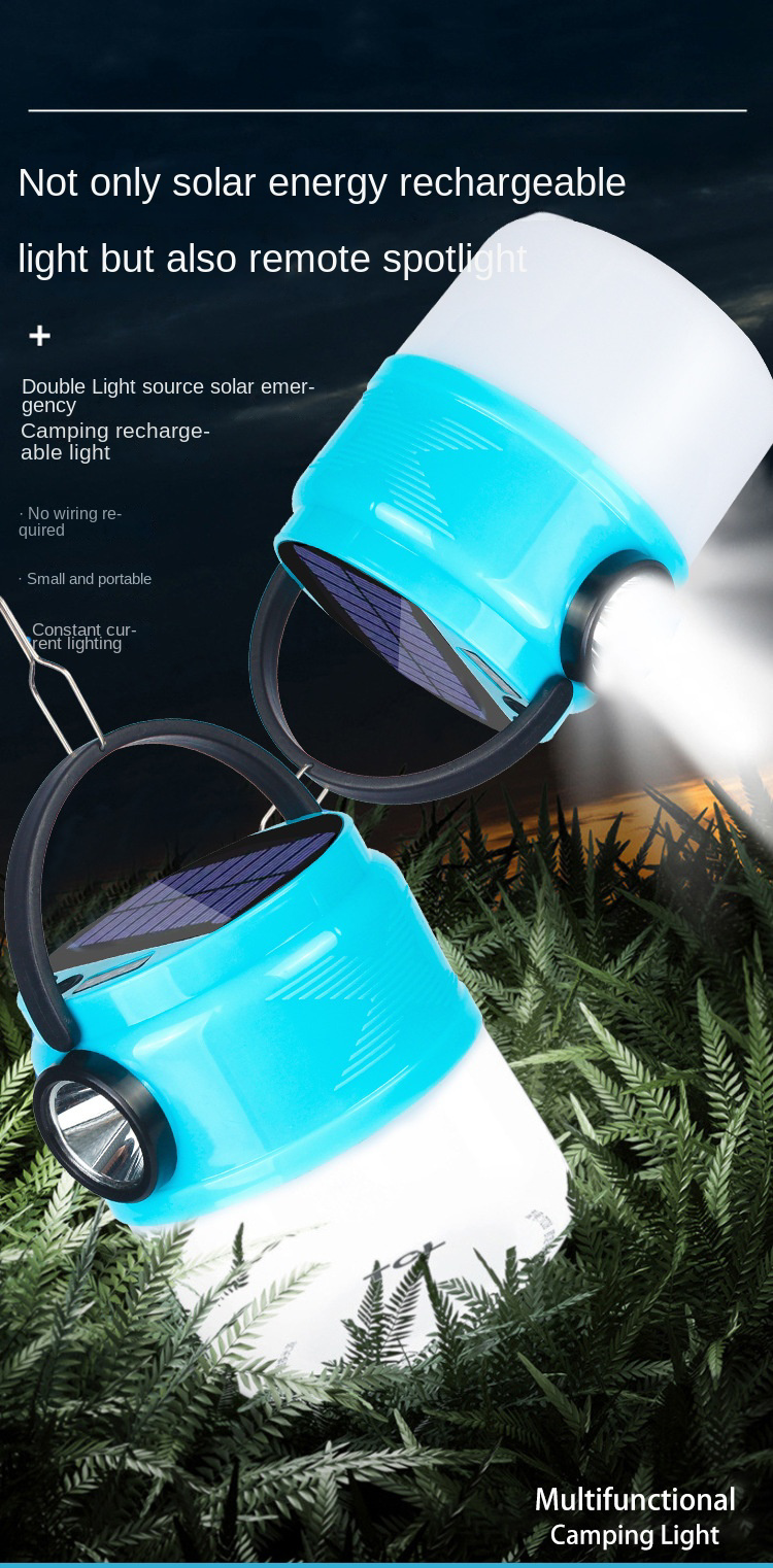 Camping light and flashlight, and it can be charged by solar power or USB direct connection, and it is fully waterproof during for rainy days.