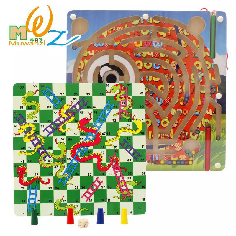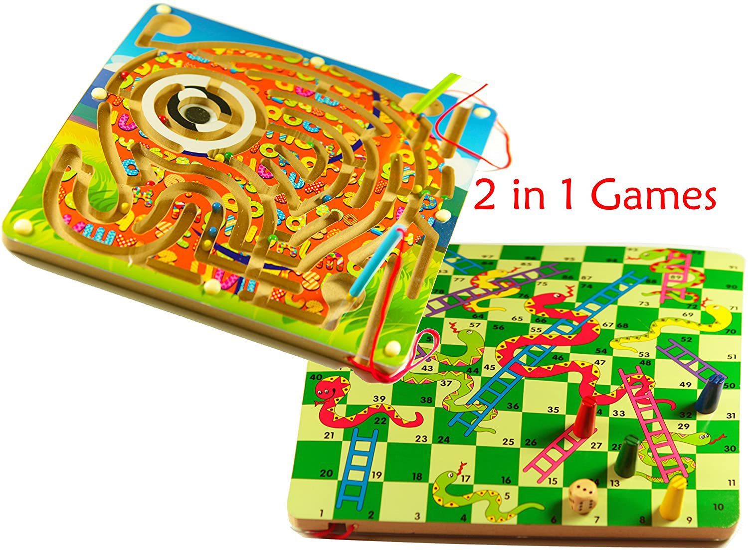 TOWO Wooden Snakes and Ladders and Elephant Magnetic Labyrinth 2 in 1 Board Game